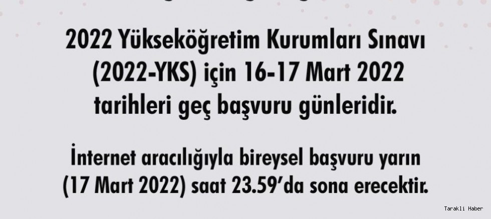 2022 Yükseköğretim Kurumları Sınavı (2022-YKS) için 16- 17 Mart 2022 tarihleri Geç başvuru günleridir.