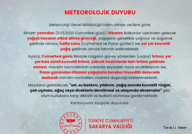 VATANDAŞLARIMIZIN DİKKATİNE Meteoroloji verilerine göre; İlimizde yarından itibaren kuvvetli fırtına ve sağanak yağış beklenmektedir. Olumsuz hava koşullarında yaşanabilecek durumlara karşı dikkatli ve tedbirli olunması gerekmektedir.