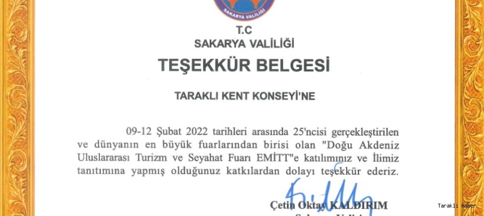 akarya Valiliği tarafından Taraklı Kent Konseyi’ne 9-12 Şubat 2022 tarihleri arasında 25.si düzenlenen ve dünyanın en büyük fuarlarından biri olan “Doğu Akdeniz Uluslararası Turizm ve Seyahat Fuarı EMITT ‘e katılarak Sakarya’nın tanıtımına yapılan katkıdan dolayı teşekkür belgesi verildi.