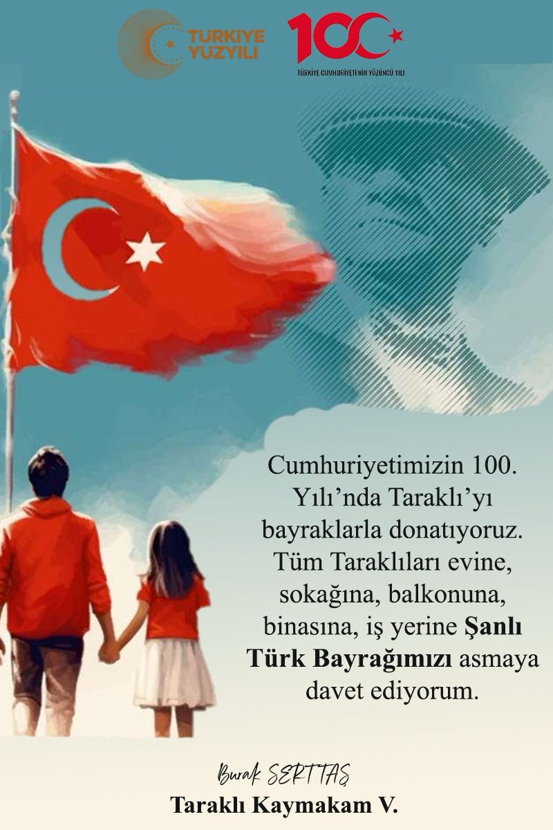 Taraklı Kaymakam vekili Burak Serttaş vatandaşlarımızdan "Cumhuriyetimizin 100. Yılı' nda Taraklı yı bayrakla donatalım. Tüm Taraklı lıları evine, sokağına, balkonuna, binasına, işyerine  Şanlı Türk Bayrağımizi asmaya" davet etti.