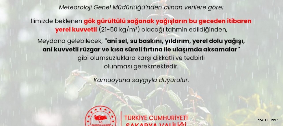 SakaryaValiliği, bu geceden itibaren ilimizde etkili olması beklenen kuvvetli gök gürültülü sağanak yağış nedeniyle dikkatli olmaları hususunda vatandaşlara uyarılarda bulundu.