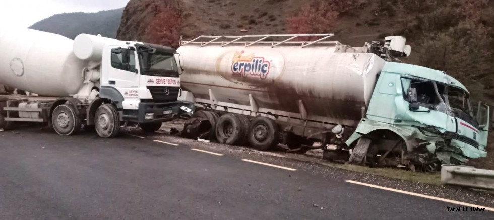Kaza, dün akşam saatlerinde meydana geldi. Mezarlık mevkiinde Taraklı’dan Geyve istikametine giden yem tankeri kamyon beton mikserine çarptı. Tanker çarpmanın etkisiyle yol kenrına savrulara bariyerlere çarptı
