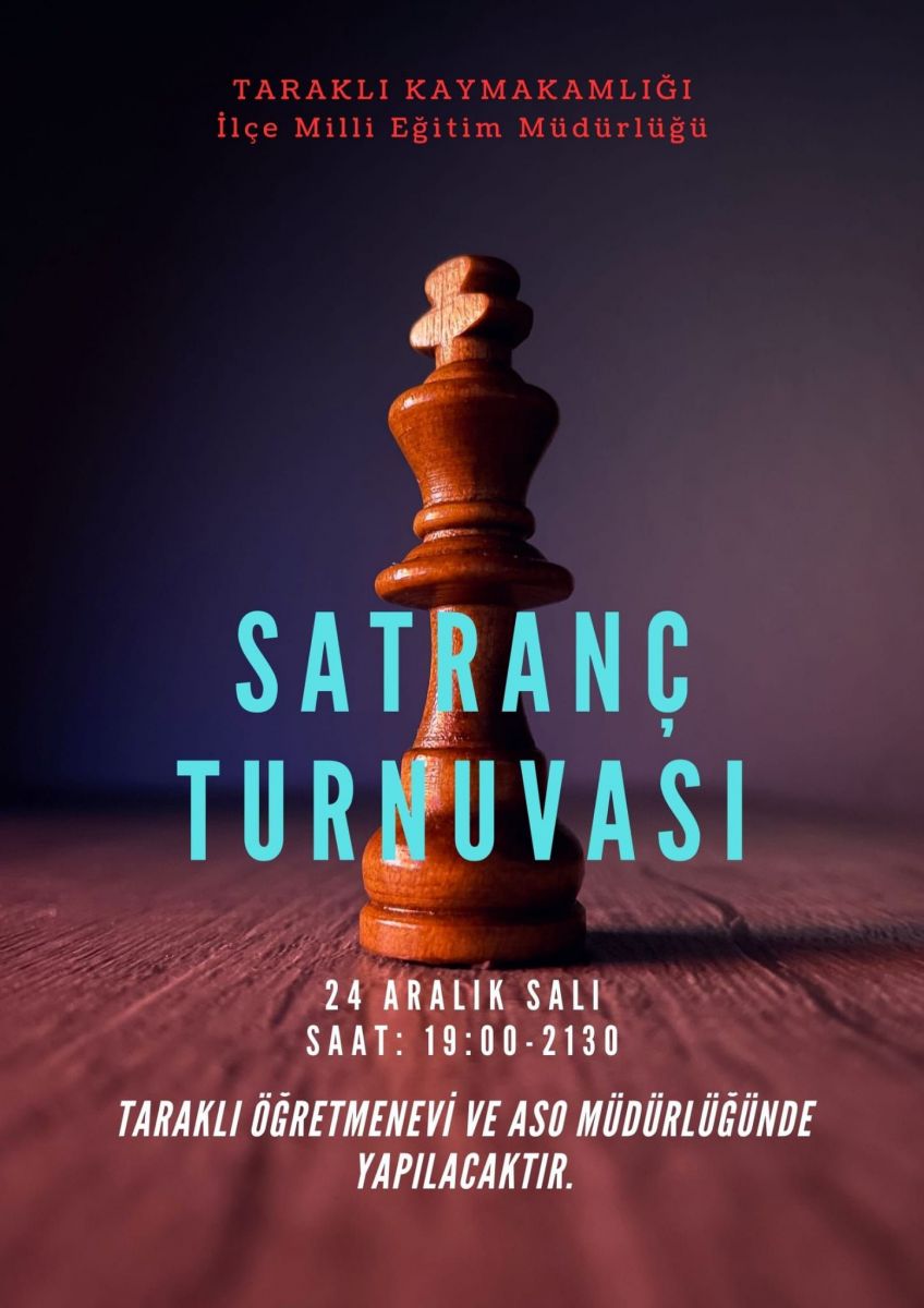 Taraklı Kaymakamlığı ve İlçe Milli Eğitim Müdürlüğü tarafından organize edilen satranç turnuvası, 24 Aralık Salı günü saat 19:00 ile 21:30 arasında Taraklı Öğretmen Evi ve Akşam Sanat Okulu (ASO)’nda gerçekleştirilecek.