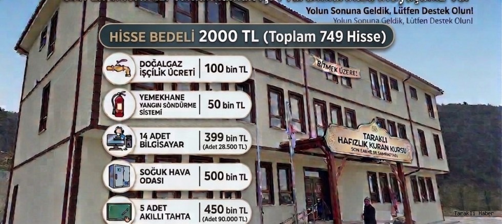 Projeye destek olmak isteyen vatandaşlar, belirtilen iletişim numaraları üzerinden detaylı bilgi alabilirken, bağışlar Taraklı Kur’an Kursu Yaptırma ve Yaşatma Derneği adına açılan hesap üzerinden kabul ediliyor.