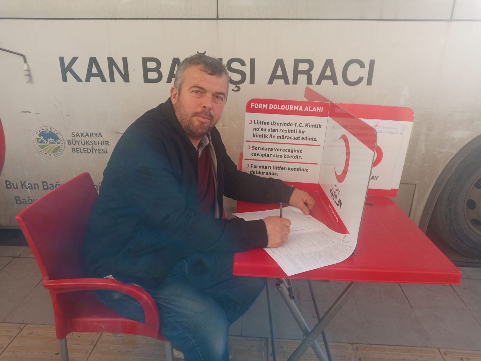 Kan bağışçıları sırasıyla bilgilendirme formlarını doldurdular, doktor muayenesi oldular ve kan bağış aracında kan bağışında bulundular.